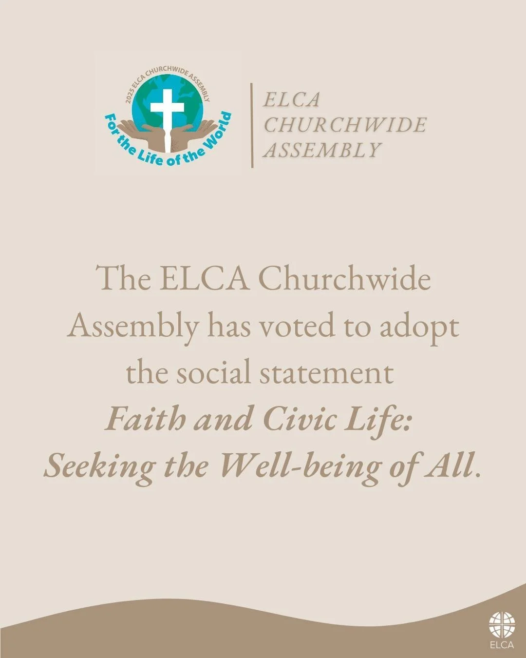 The ELCA Churchwide Assembly has overwhelmingly adopted Faith and Civic Life: Seeking the Well-being of All, a social statement on the relationship between church and state. This theologically grounded document guides Lutherans in civic engagement, aiming to help shape conscience and inform faithful action in public life. Developed over several years through churchwide participation, this statement encourages us to pursue justice, peace, and the common good. To explore the full statement and the process behind it, click here for more.