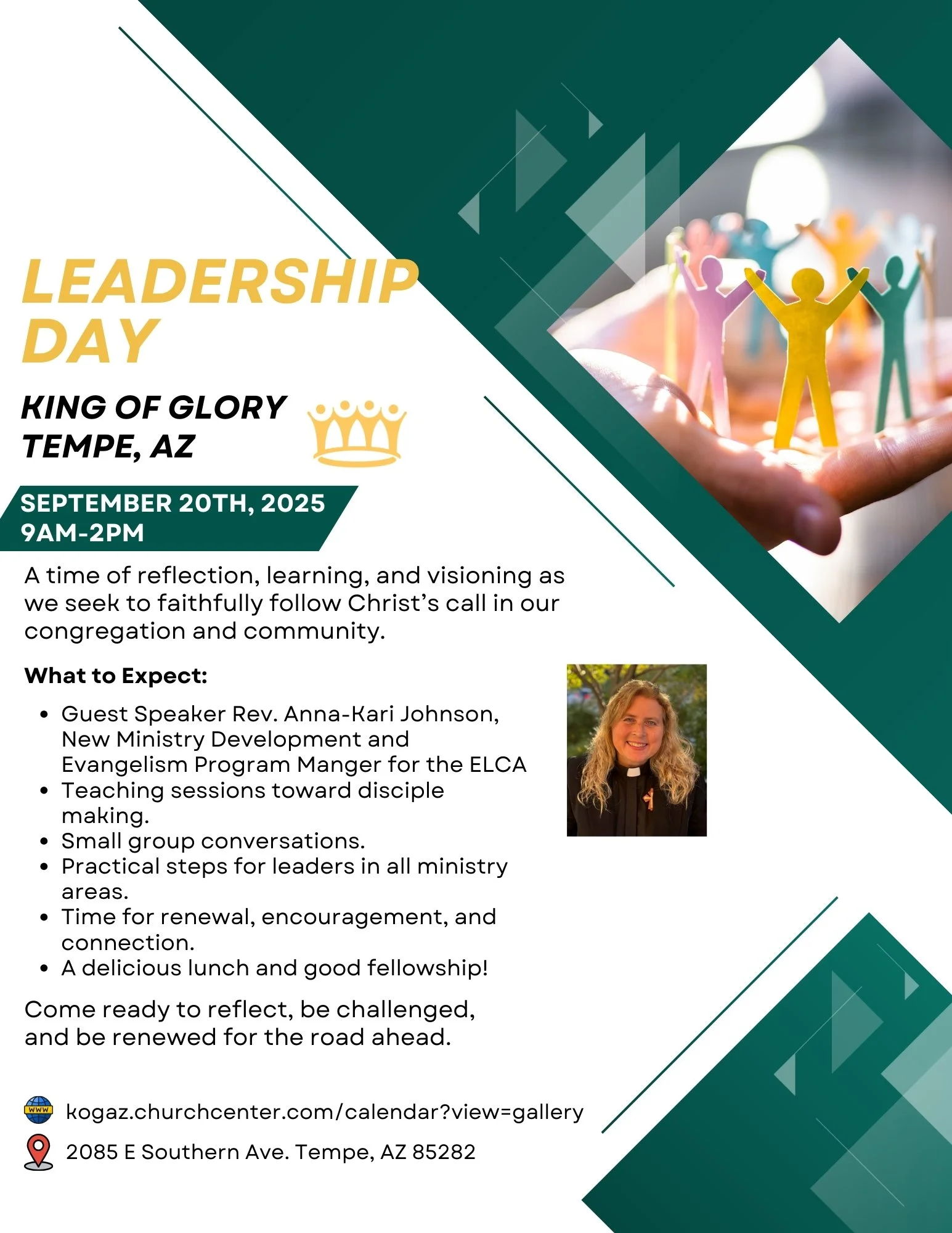 Leaders from across the Grand Canyon Synod are invited to gather for Leadership Day on Saturday, September 20, 2025, from 9:00 a.m. to 2:00 p.m. at King of Glory Lutheran Church in Tempe, AZ (2085 E Southern Ave.). This gathering is designed to provide space for reflection, visioning, and encouragement as we seek to faithfully follow Christ’s call in our congregations and communities.