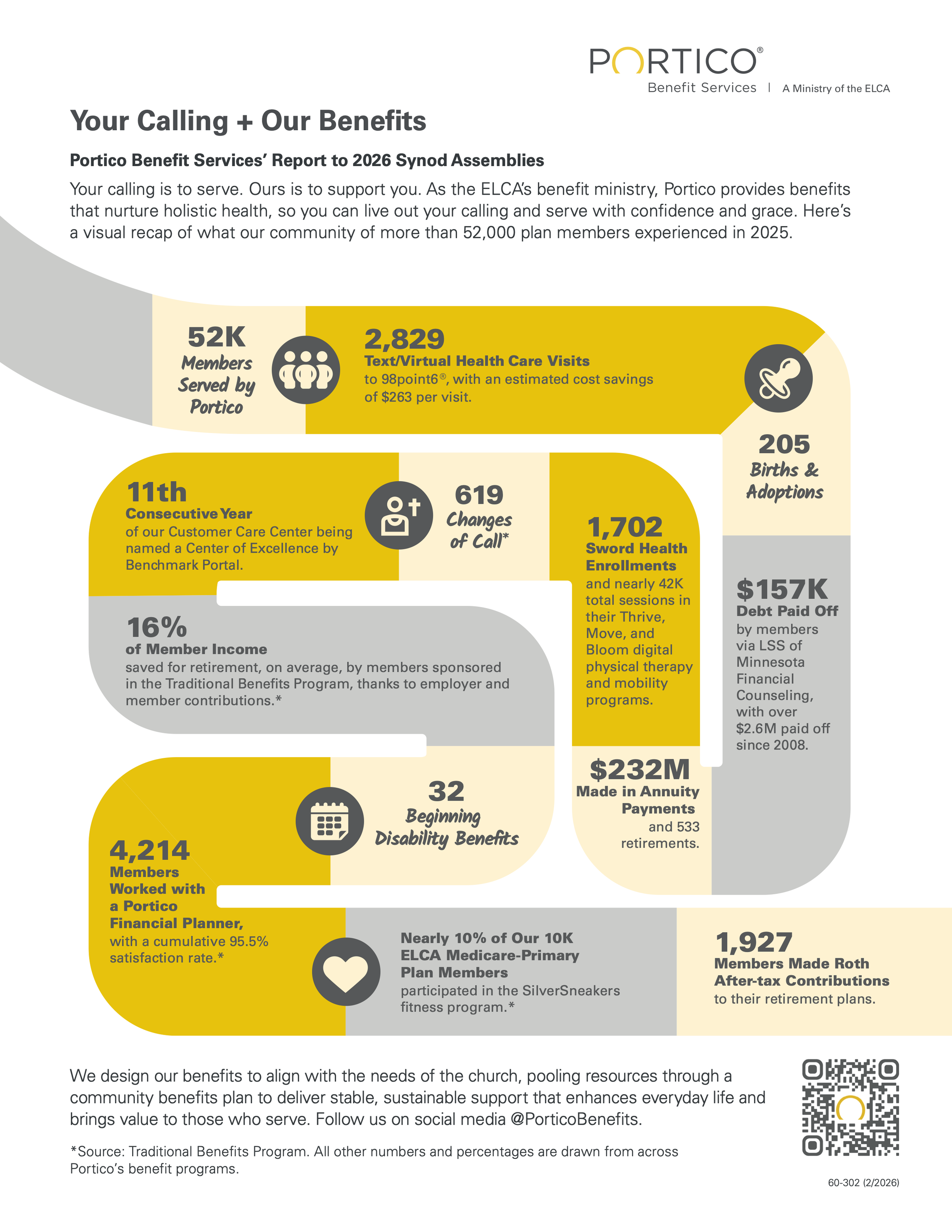 We invite you to explore the work of Portico Benefit Services — the ELCA’s ministry of benefits — through their annual report and video, Stronger Together: The Power of a Connected Community.