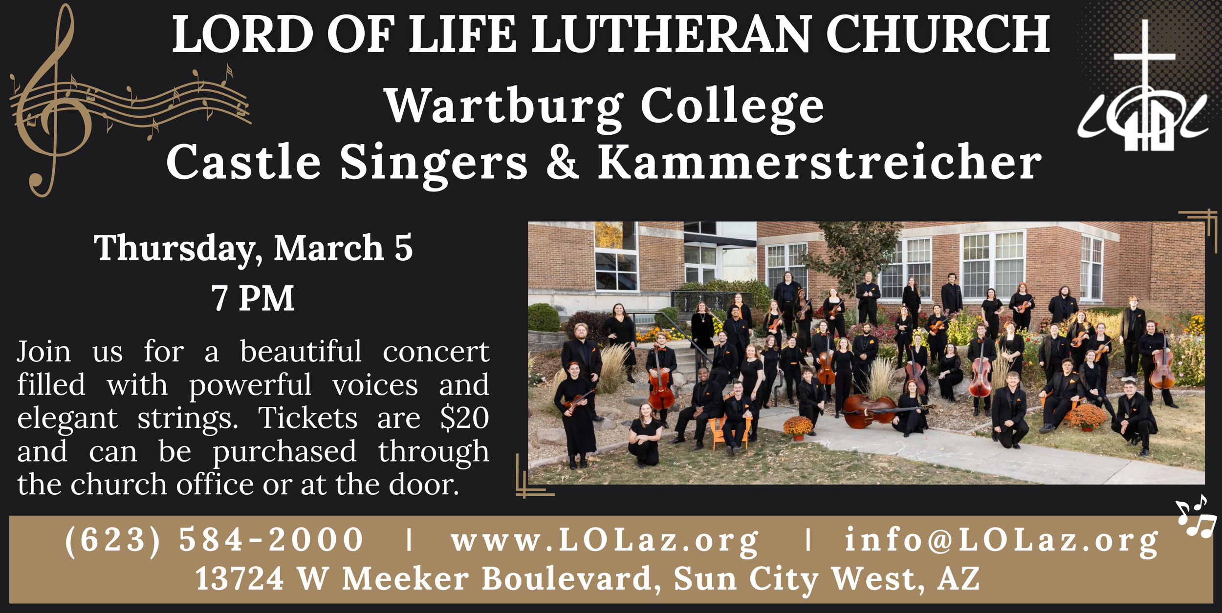 Lord of Life Lutheran Church in Sun City West will host the Wartburg College Castle Singers and Kammerstreicheron Thursday, March 5, 2026 at 7:00 PM, offering our synod an evening rooted in Lutheran musical excellence.